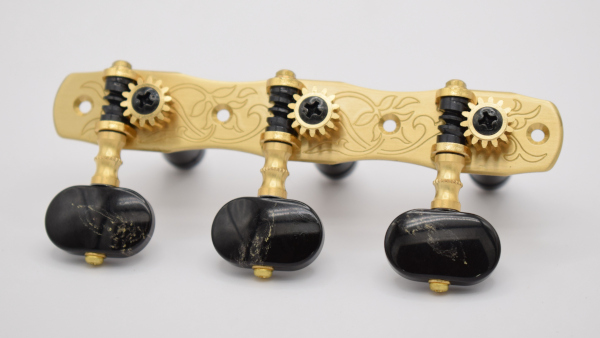 An elegantly engraved plate of solid brass with a 14:1 gear ratio and the black alloy roller with bearings. Comes with the economical polymer buttons. Price reduced because of slight roller damage in shipping.
