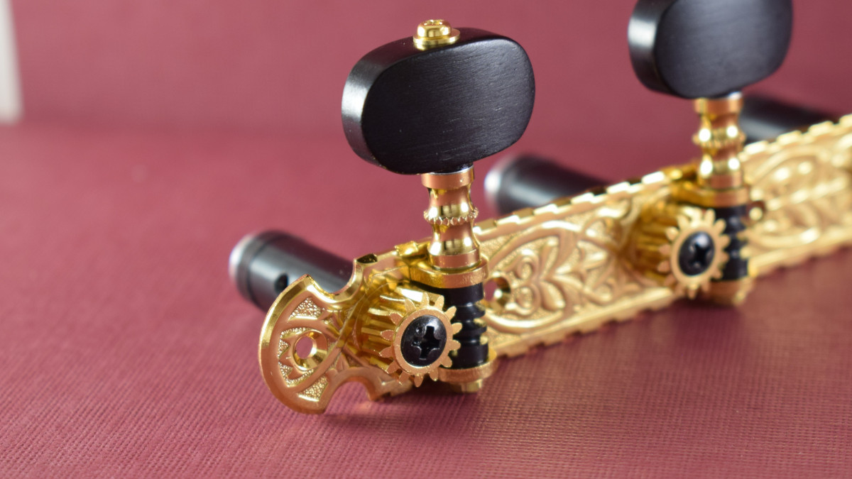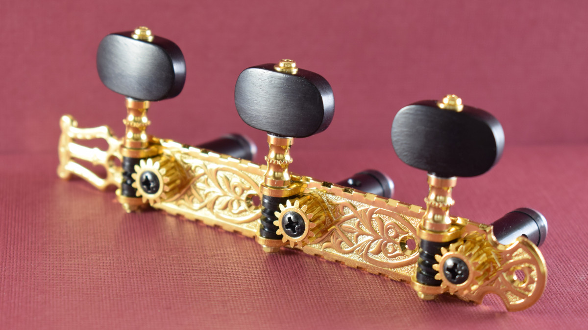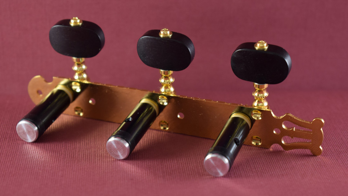 This is a replacement set for the old Madrid school guitars made for roller spacings of 39mm. It has ebony buttons, rollers with bearings and a 14:1 gear ratio.